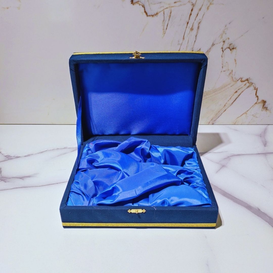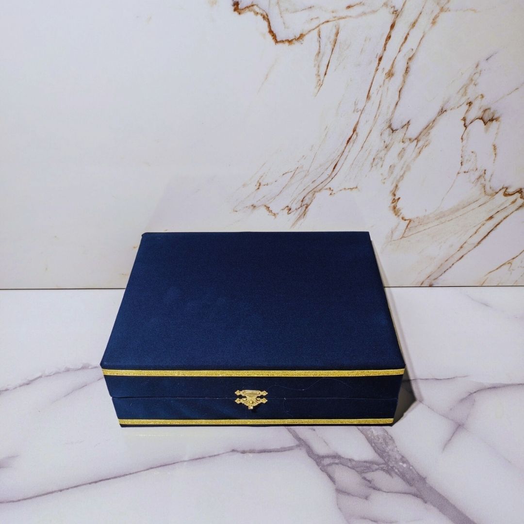 Bu asil mavi kadife kutu, göz alıcı zarafeti ve özenli detaylarıyla dikkat çekiyor. Altın rengindeki tokası, kutuya hem pratik bir dokunuş hem de zarif bir estetik katıyor. Mermer bir yüzey üzerinde sergilenen bu kutu, içindeki değerli eşyaları güvenle muhafaza ederken, bulunduğu ortamın atmosferini de tamamlayan şık bir aksesuar olarak öne çıkıyor. Kadife dokusu, hem görsel hem de dokunsal bir zenginlik sunarak, lüks ve sofistike bir yaşam tarzını temsil ediyor. Çekici tasarımıyla bu kutu, hem hatıralarınızı korumanız hem de şıklığı vurgulamanız için kusursuz bir seçenek.