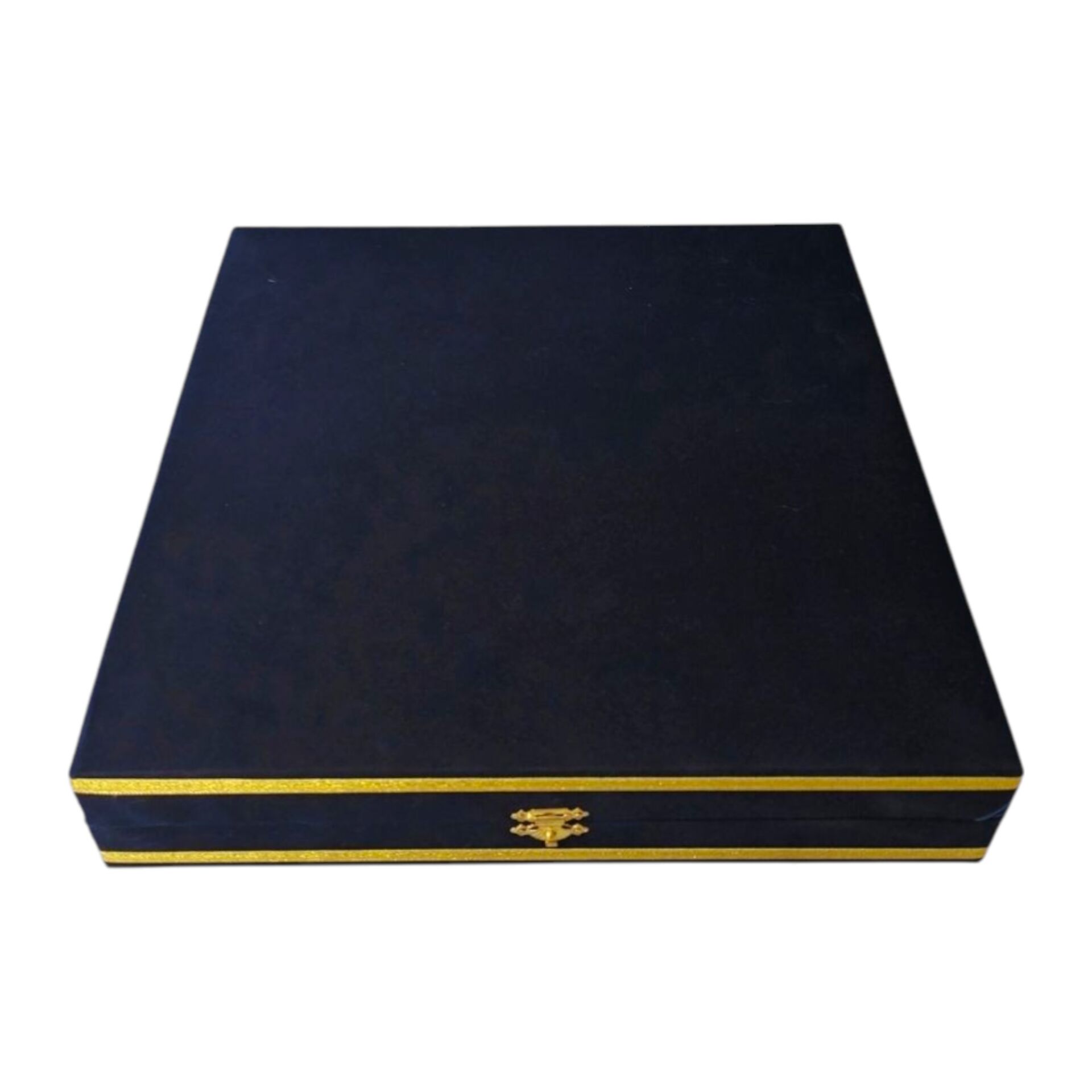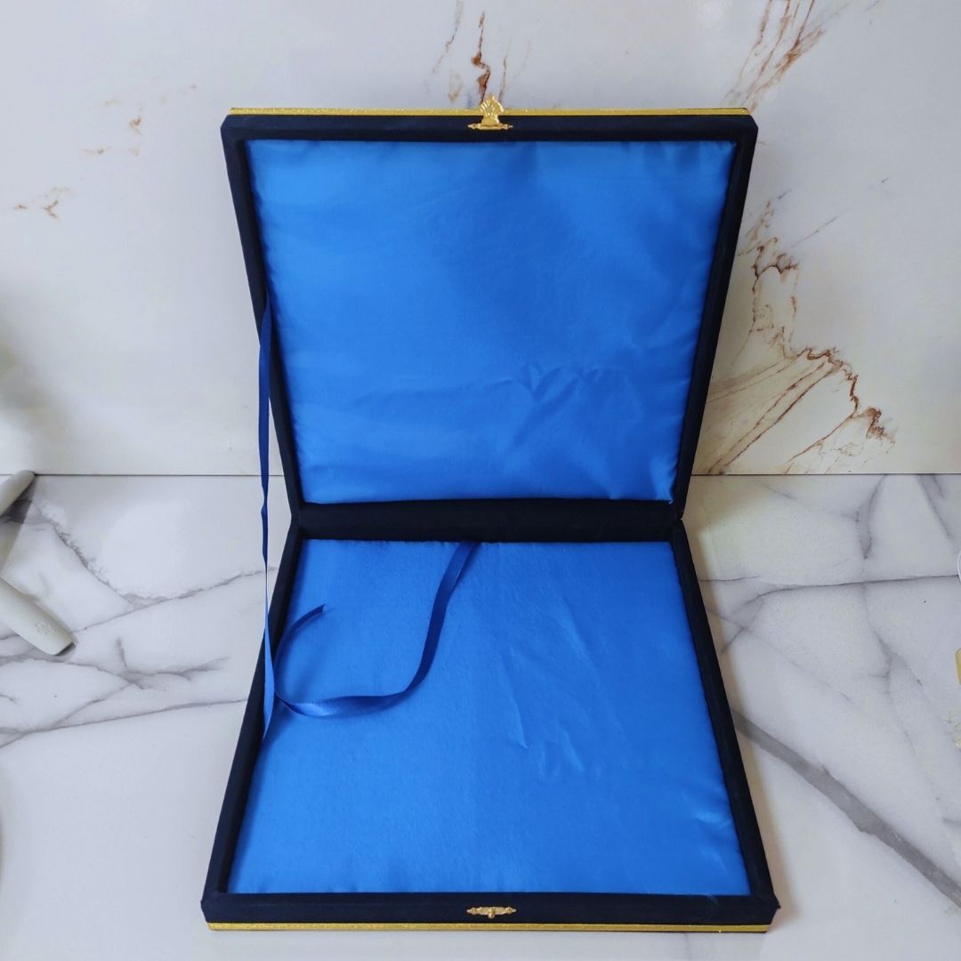 Bu derin lacivert kadife kutu, lüksün ve inceliğin somut bir yansıması. Kutunun zengin tonu, göz alıcı altın detaylarla bir araya gelerek asil bir duruş sergiliyor. Mermer yüzey üzerinde yer alan bu kutu, içindeki kıymetli hatıraları ya da zarif takıları özenle koruma görevini üstleniyor. Kadife dokusu, dokunsal bir keyif sunarken aynı zamanda şıklığı tamamlıyor. Altın renkli tokası ise hem estetik hem de pratik bir detay olarak ön plana çıkıyor. Bu kutu, yalnızca bir saklama objesi değil, aynı zamanda bir yaşam tarzını yansıtan zarif bir aksesuar.