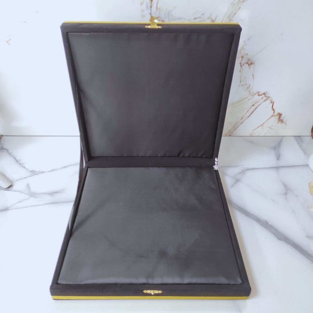 Bu derin siyah kadife kutu, lüksün ve inceliğin somut bir yansıması. Kutunun zengin tonu, göz alıcı altın detaylarla bir araya gelerek asil bir duruş sergiliyor. Mermer yüzey üzerinde yer alan bu kutu, içindeki kıymetli hatıraları ya da zarif takıları özenle koruma görevini üstleniyor. Kadife dokusu, dokunsal bir keyif sunarken aynı zamanda şıklığı tamamlıyor. Altın renkli tokası ise hem estetik hem de pratik bir detay olarak ön plana çıkıyor. Bu kutu, yalnızca bir saklama objesi değil, aynı zamanda bir yaşam tarzını yansıtan zarif bir aksesuar.