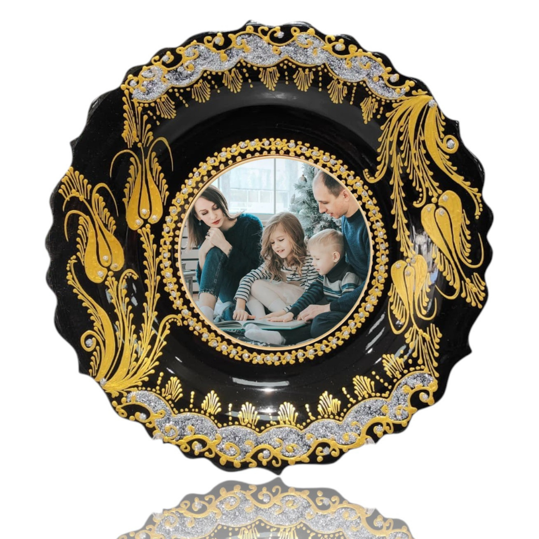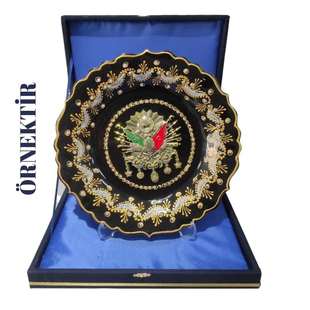 Dm Porselen Siyah Altın El Yapımı Kadife Kutulu Hediyelik Plaket Çini Tabak (Logo, Resim ve Yazı Tasarımlı)