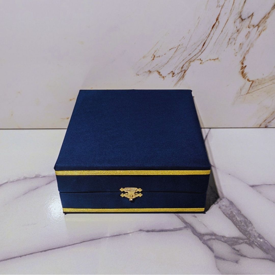 Derin bir maviye sahip bu kadife kutu, hem görselliği hem de işlevselliğiyle göz dolduruyor. Altın renkli tokası, kutuya sofistike bir hava katarken aynı zamanda güvenli bir saklama imkanı sunuyor. Kutunun yumuşak kadife yüzeyi, zarafetin ve şıklığın bir arada sunulduğu bir dokunsallık sağlıyor. Mermer bir zeminde sergilenen bu kutu, bulunduğu ortamda lüksün ve inceliğin bir simgesi olarak dikkat çekiyor. Hem zarif bir dekoratif obje hem de değerli eşyalarınızı saklamak için ideal bir alan... Bu kutu, estetik ve kullanışlılığı harmanlayan mükemmel bir seçim.